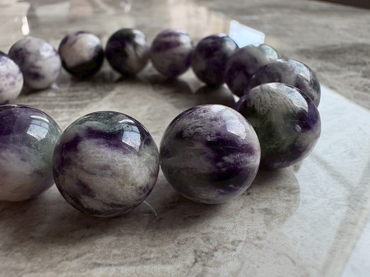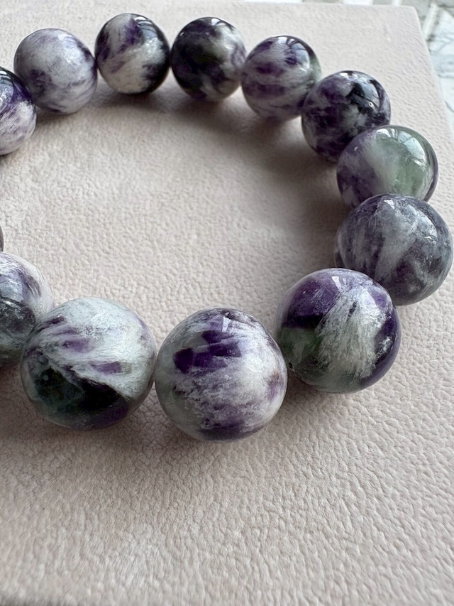 繊細で美しい「フェザーフローライト」ブレスレット。 16mmの大粒ビーズが持つ、優雅な色合いと羽のような模様が特徴的で、見る者を魅了します カラー: グリーン、パープルの織りなす色合いが幻想的で、個々の模様が石の自然な美しさを際立たせます。 エネルギー: 集中力を高め、思考をクリアにする効果があるとされ、心を落ち着かせるサポートをします。 デザイン: 大きめの16mmビーズは存在感があり、シンプルでありながら独特の華やかさを演出。 自分自身への癒し、または特別な贈り物としてもおすすめの一品です。 フェザーフローライトの優しいエネルギーをぜひ感じてください。