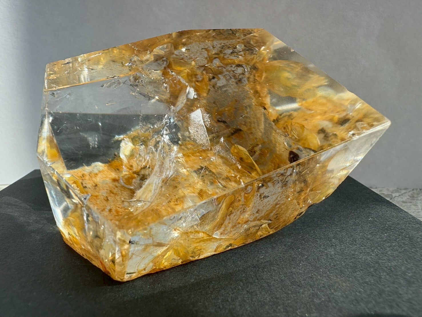 シトリンタワー(ファントム入り) この特別なシトリンタワーは、内部に神秘的なファントムを内包しており、重厚感のある美しさを放っています。 クリスタルの色合い: 鮮やかなゴールドから淡いイエローのシトリンが、太陽のエネルギーを象徴し、豊かさと成功を促します。 ファントムの魅力: クリスタル内部に見える成長の痕跡であるファントムは、成長や変化、進化の象徴として特に人気があります。 精神的効果: ポジティブなエネルギーを引き寄せ、心を明るくし、自信や自己表現を高めます。 自然のアートとも言えるこのシトリンタワーは、あなたの空間を明るくし、心地よいエネルギーで満たしてくれるでしょう。