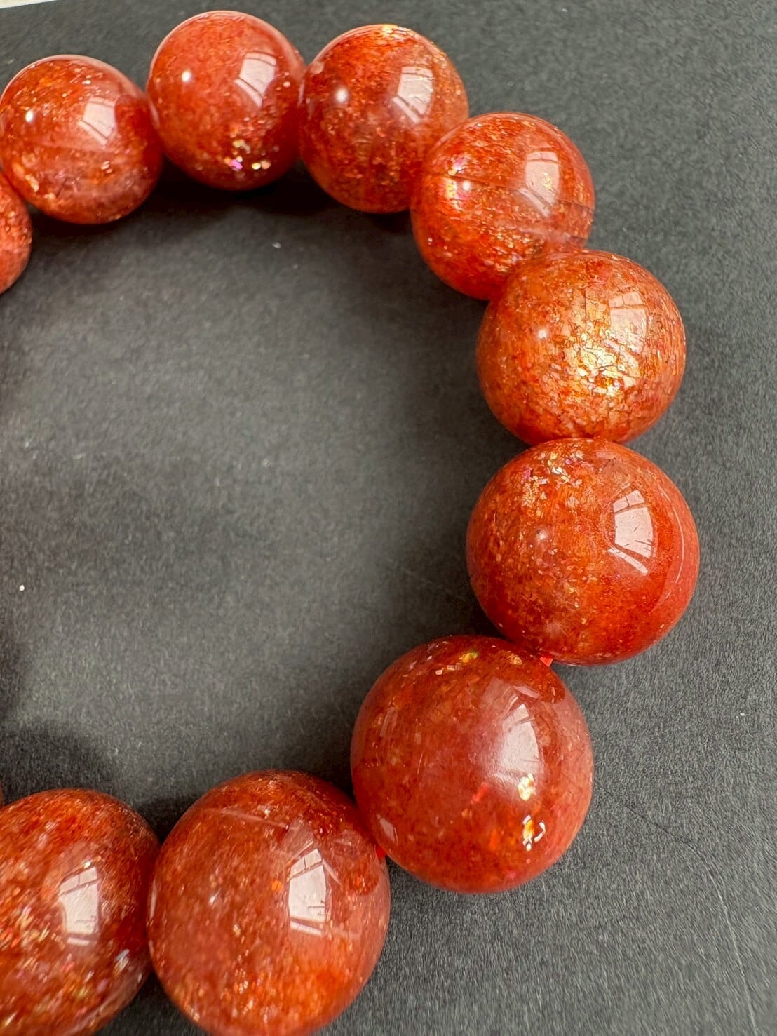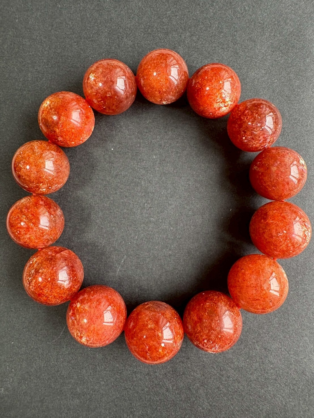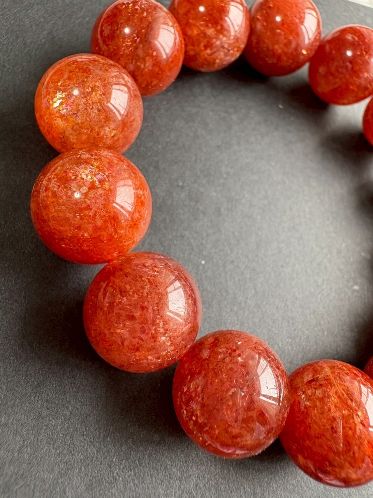 希少な大玉高品質なタンザニア産サンストーンの大玉ブレスレットです。 ギラギラと輝く美しい光沢と、自然の持つ幻想的な色合いが魅力です。 自然由来の豪華な石の模様と輝きが、見る角度や光の当たり方によってさまざまに変化し、エレガントな印象を与えます