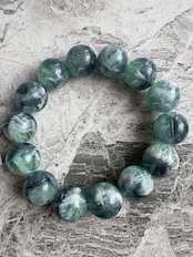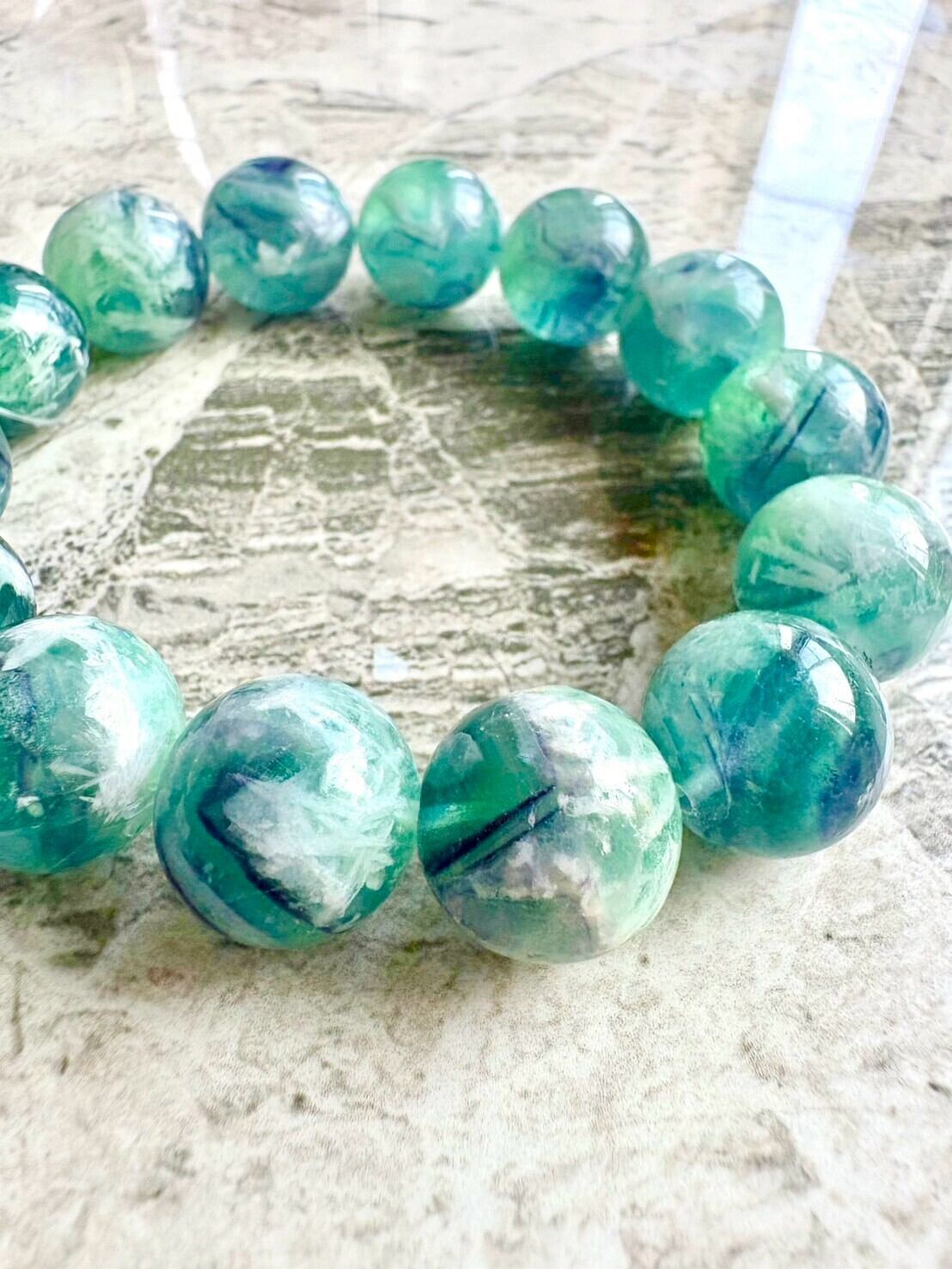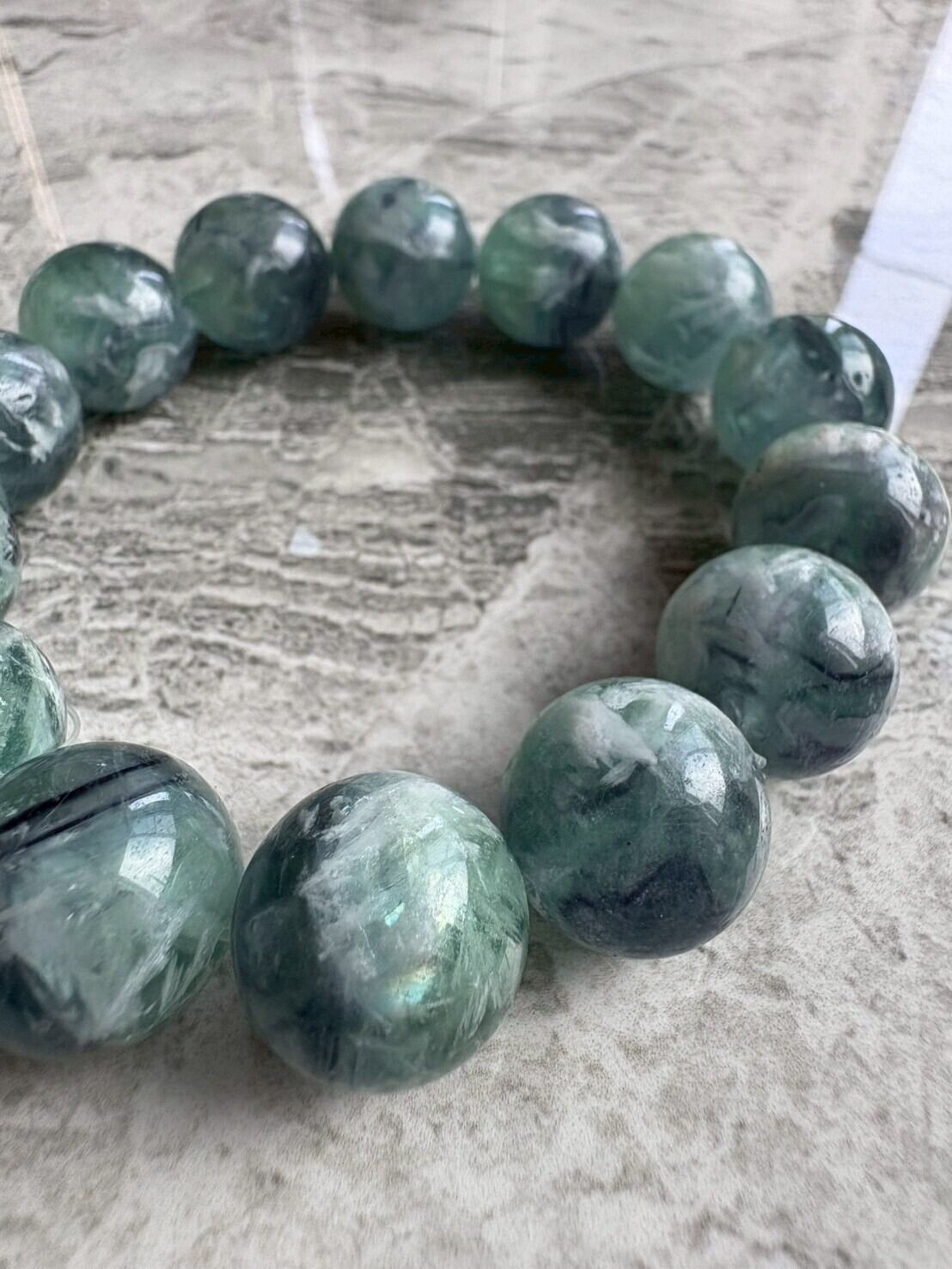 このフェザーフローライトは、16mmの大粒ビーズを使用した高品質な天然石のブレスレットです。緑や青の美しいグラデーションと、羽のような模様を持つ神秘的なデザインが魅力的です。