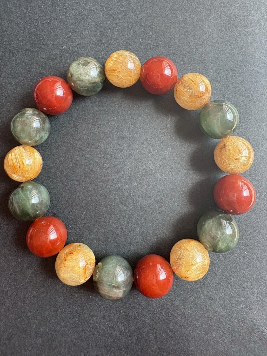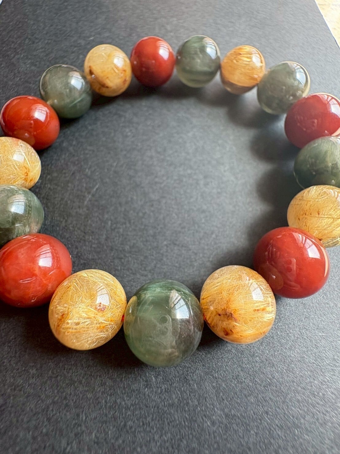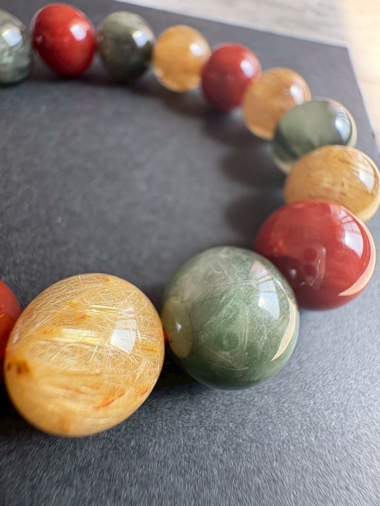魅力的なマルチカラーのルチルは、色とりどりのストライプが特徴で、そのエネルギーは非常に力強く、あなたの生活にポジティブな変化をもたらします。美しい色合いは、スタイルに華やかさを加え、運気アップのお手伝いをします。マルチカラールチルは「豊かさを引き寄せる石」として多くの方に愛されています。